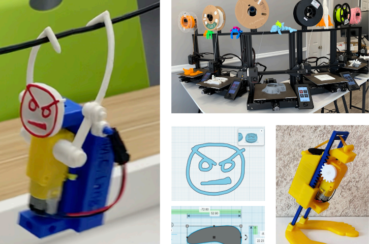 3D print and build a zipline robot and a jumping robot. 3D emoji and parts design.